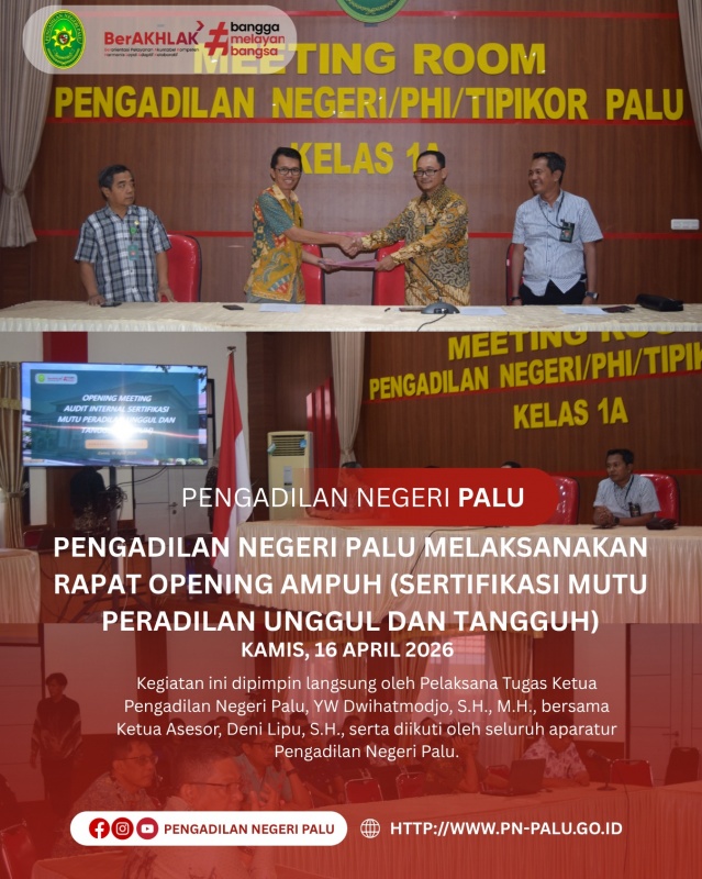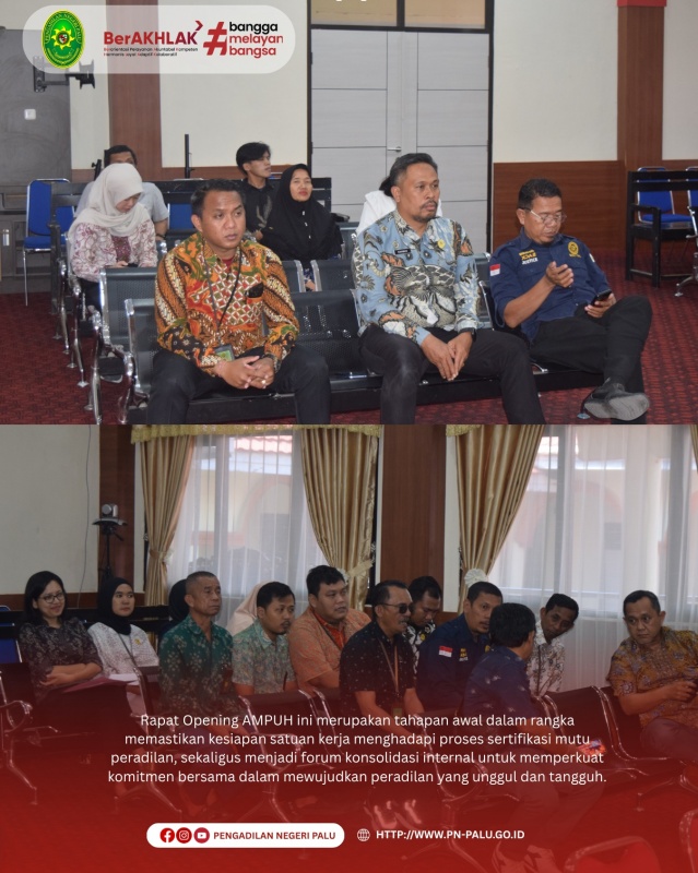 Pengadilan Negeri Palu melaksanakan Rapat Opening AMPUH (Sertifikasi Mutu Peradilan Unggul dan Tangguh) sebagai bagian dari upaya strategis dalam meningkatkan kualitas kinerja dan pelayanan peradilan. Kegiatan ini dipimpin langsung oleh Pelaksana Tugas Ketua Pengadilan Negeri Palu, YW Dwihatmodjo, S.H., M.H., bersama Ketua Asesor, Deni Lipu, S.H., serta diikuti oleh seluruh aparatur Pengadilan Negeri Palu. Rapat Opening AMPUH ini merupakan tahapan awal dalam rangka memastikan kesiapan satuan kerja menghadapi proses sertifikasi mutu peradilan, sekaligus menjadi forum konsolidasi internal untuk memperkuat komitmen bersama dalam mewujudkan peradilan yang unggul dan tangguh. Dalam arahannya, Plt. Ketua Pengadilan Negeri Palu menegaskan pentingnya integritas, profesionalisme, serta sinergi seluruh aparatur dalam mendukung keberhasilan pelaksanaan AMPUH. Beliau juga mengingatkan agar setiap unsur di lingkungan Pengadilan Negeri Palu dapat menjalankan tugas dan fungsi secara optimal sesuai standar yang telah ditetapkan. Sementara itu, Ketua Asesor, Deni Lipu, S.H., menyampaikan bahwa Sertifikasi Mutu Peradilan Unggul dan Tangguh (AMPUH) merupakan instrumen penting dalam mendorong peningkatan kualitas tata kelola peradilan, baik dari aspek administrasi, pelayanan publik, maupun pengawasan internal. Oleh karena itu, diperlukan kesiapan yang matang serta komitmen bersama dari seluruh aparatur. Kegiatan rapat berlangsung dengan tertib dan penuh antusiasme. Seluruh peserta mengikuti rangkaian acara dengan seksama sebagai bentuk kesungguhan dalam mendukung peningkatan mutu peradilan. Melalui pelaksanaan Rapat Opening AMPUH ini, diharapkan Pengadilan Negeri Palu semakin siap dalam mewujudkan peradilan yang berintegritas, profesional, serta memberikan pelayanan hukum yang prima kepada masyarakat pencari keadilan.